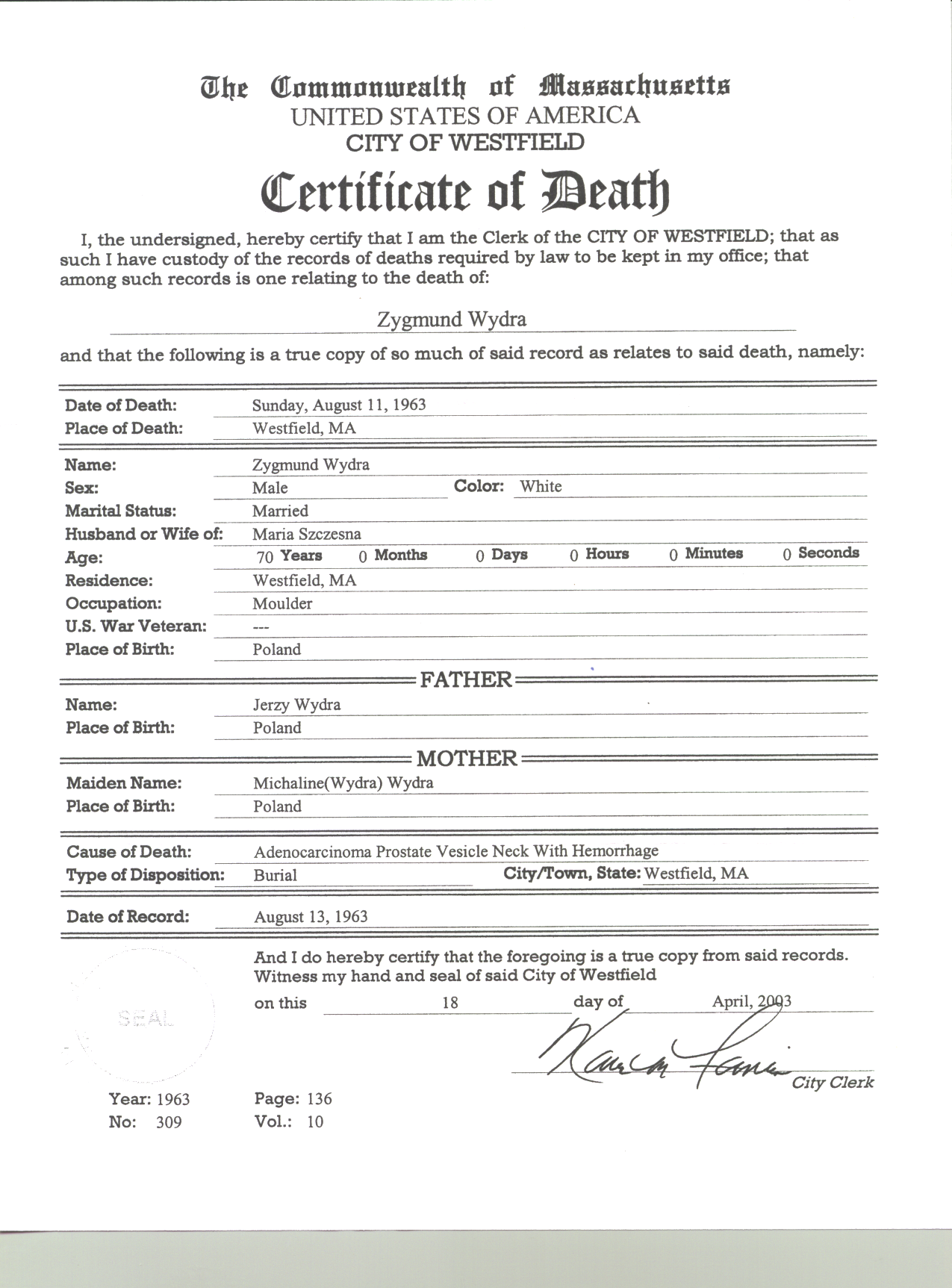 - [S106] Westfield MA Deaths: Certificate of Death for Zygmund Wydra, 1963, Page 136, No: 309, Vol 10. Husband of Maria Szczesna, Occupation Moulder, POB: Poland. Father's name Jerzy Wydra, mother Michaline (Wydra) Wydra..